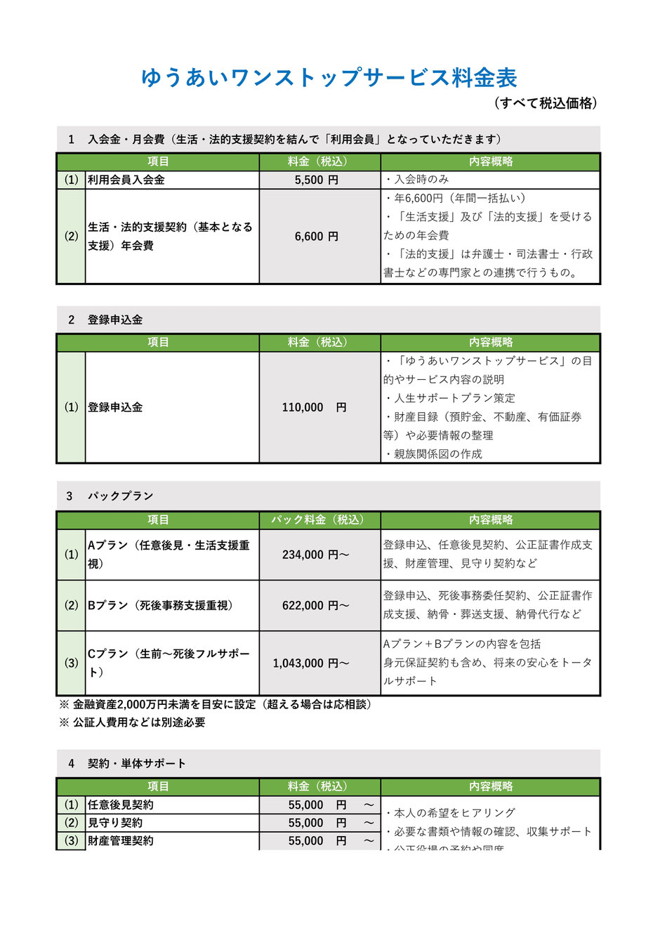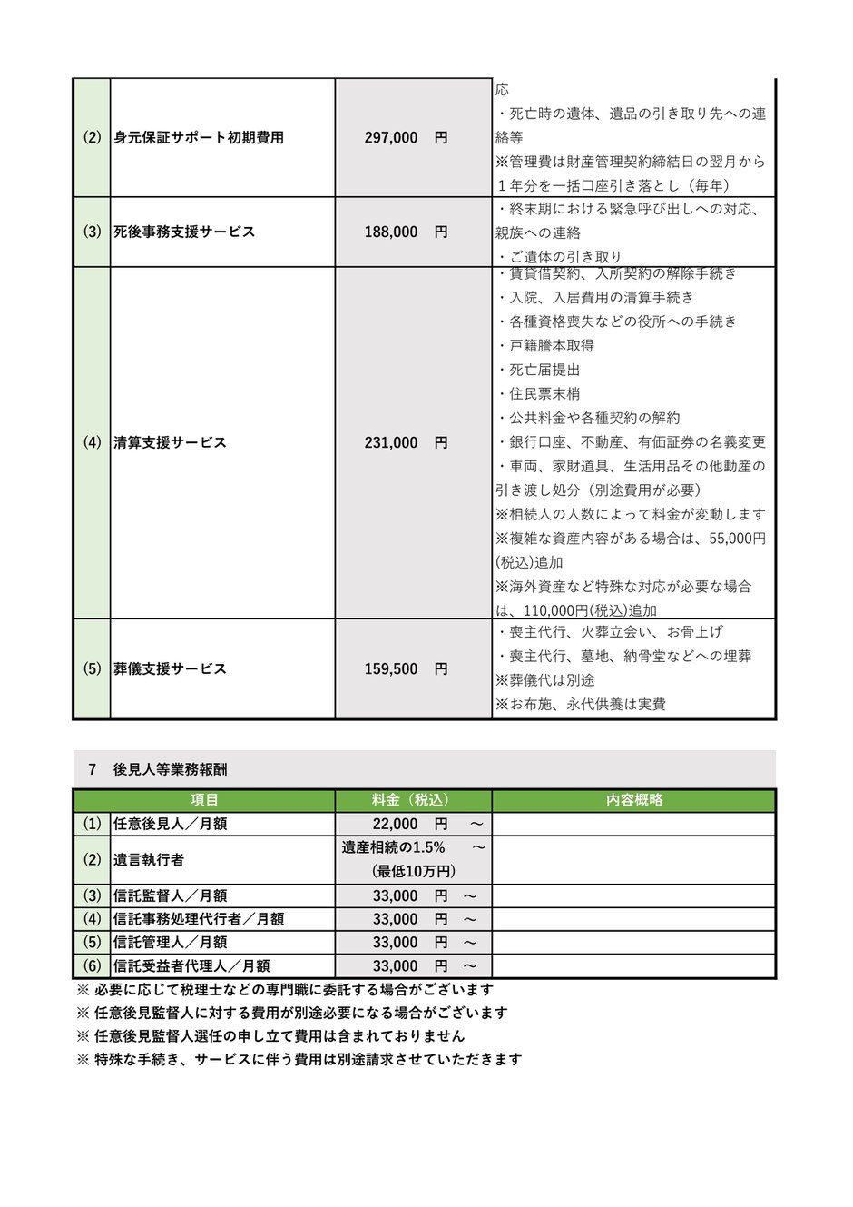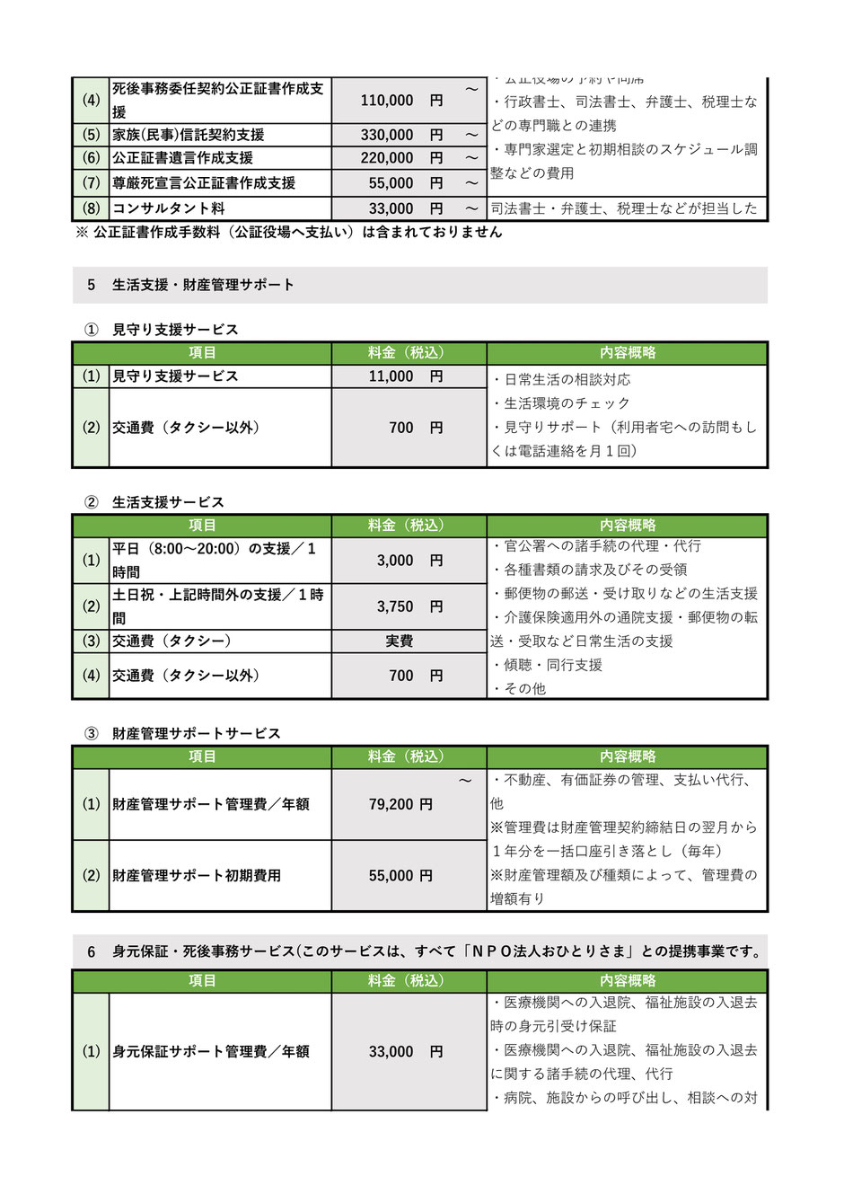 以下の料金表において、「6 身元保証・死後事務サービス」(身元保証サポート管理費/年額、身元保証サポート初期費用、終焉支援サービス、清算支援サービス、葬儀支援サービス)については、「NPO法人おひとりさま」に委託するサービスです。